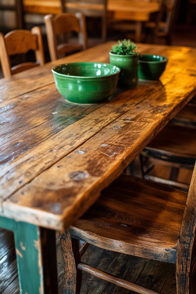 Reclaimed wood furniture combined with green accents creates a timeless, eco-friendly style that feels genuine and inviting. It’s a sustainable choice that adds real character and history to your space. Once finished, your dining room will radiate warmth and authenticity—perfect for both everyday meals and special gatherings. Embrace the natural, imperfect beauty of reclaimed wood and enjoy the compliments!