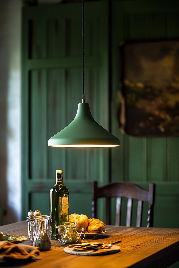 7. Install Green-Toned Pendant Lighting for Ambient Glow