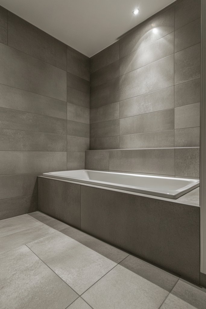 Cleaning and maintaining bathroom tiles can be a hassle, especially with grout lines trapping dirt. Large grey porcelain tiles reduce this burden, offering a sleek, easy-to-clean surface that stays looking fresh longer. If you want a stylish, low-effort solution, this idea ticks all the boxes.