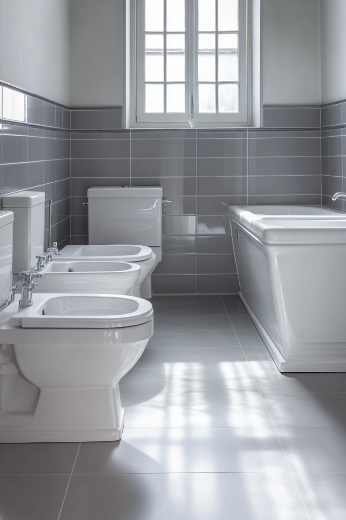Picture a bathroom where white sinks, toilets, and tubs stand out against a backdrop of soft grey tiles. The contrast creates a crisp, clean look that’s both calming and energizing. The white fixtures reflect light, brightening the room further. The overall effect is a minimalist, spa-like environment that feels spacious and hygienic.