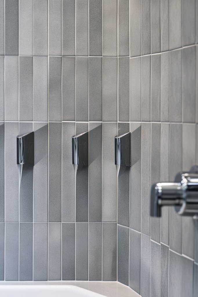 Picture a wall with grey tiles laid in a diagonal herringbone or herringbone pattern. The geometric arrangement creates movement and catches light in unexpected ways. Vertical stacking elongates the space, making ceilings feel higher. The pattern draws the eye upward or across, adding energy and sophistication.