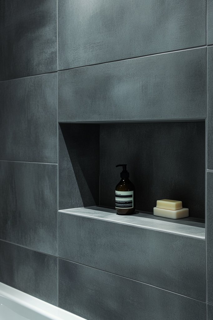 Visualize a recessed shelf carved into the wall, tiled with the same grey tiles as the surrounding area. It creates a clean, streamlined look that doesn’t interrupt the flow of the space. Use it to display essentials or hide toiletries. The uniform tiles and discreet design reinforce a tidy, modern vibe.