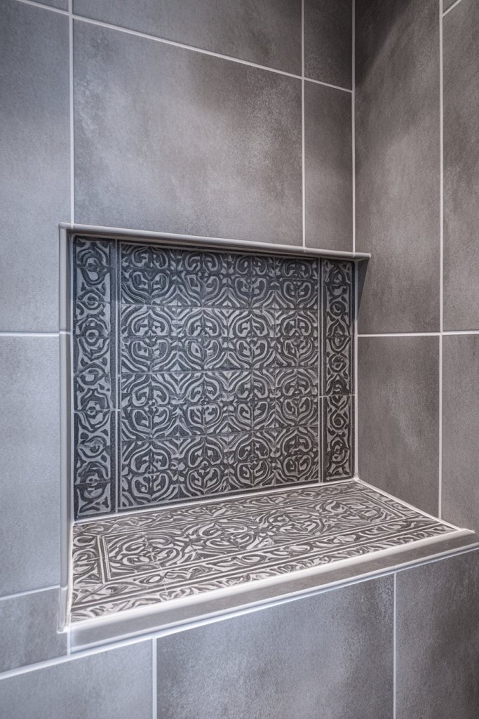 Sometimes, plain tiles can feel a bit too safe or bland. Adding patterned grey tiles as accent borders or in niches instantly elevates the visual interest. It introduces a subtle layer of complexity without overwhelming the overall neutral palette. If you crave a dash of personality in your bathroom, this idea will inspire you.