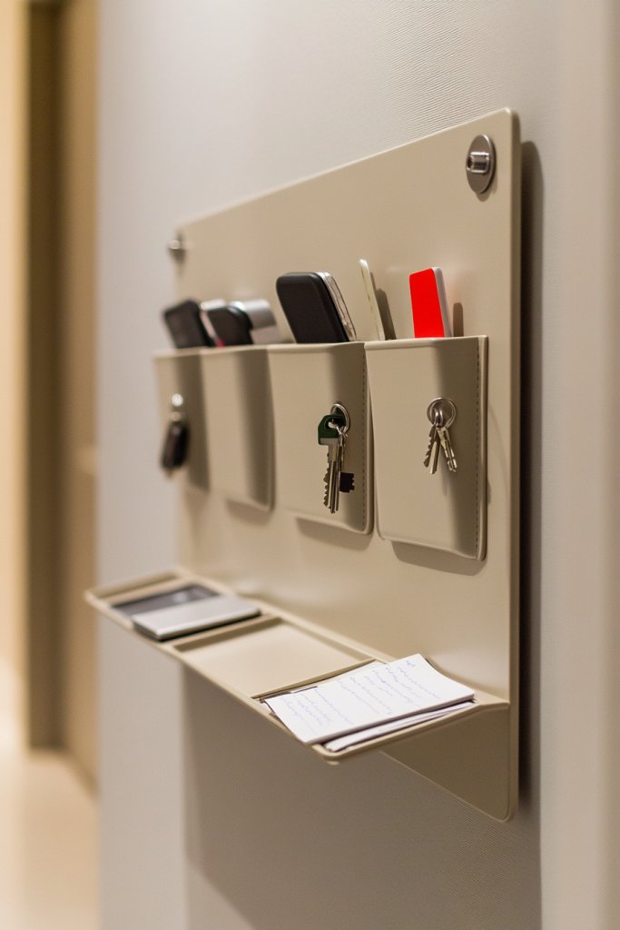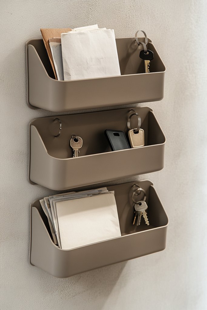 Visualize a sleek, multi-level organizer mounted near the door, with slots for mail, hooks for keys, and small compartments for wallets or sunglasses. The unit’s clean design blends into your decor, providing a dedicated spot for everything. Mail stacks neatly in designated slots, while keys hang in easy reach. It’s a tidy, organized look that feels intentionally designed.