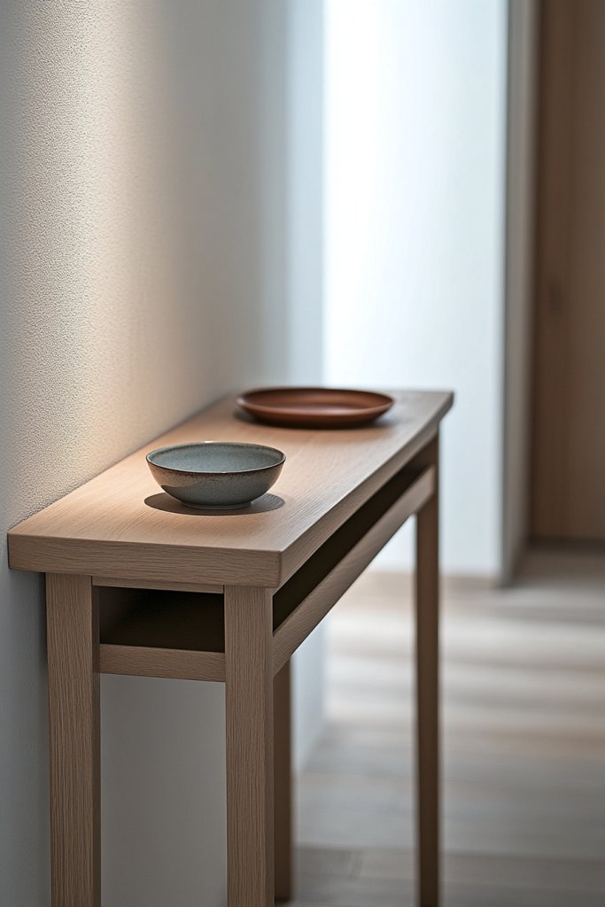 Picture a slim, sleek console table hugging the wall, topped with a textured runner or a decorative tray. Beneath, drawers or woven baskets hide away mail, scarves, or shoes, keeping clutter out of sight. The table’s surface can hold a catchall dish, a small sculpture, or a decorative bowl—no clutter, just curated charm. The overall look feels intentional and welcoming.