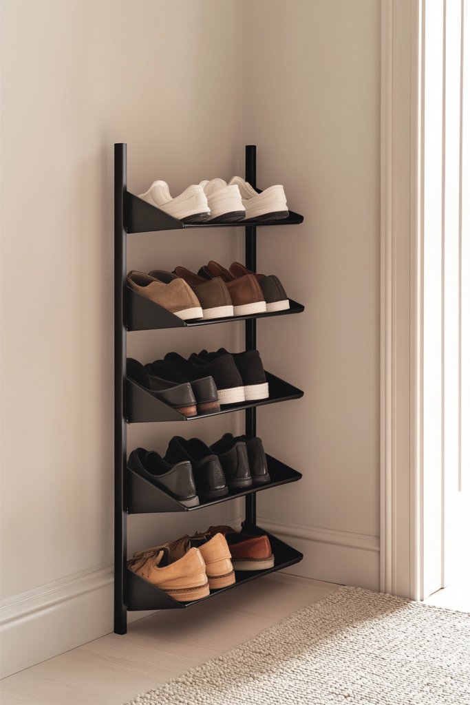 Visualize a slim, tiered rack along the wall, made of sleek metal or sturdy wood. Shoes are neatly arranged in rows—slippers, sneakers, boots—everything visible at a glance. The rack’s vertical design saves floor space, leaving room for a slim bench or decorative mat. It creates an organized, clutter-free entryway that looks effortlessly tidy.