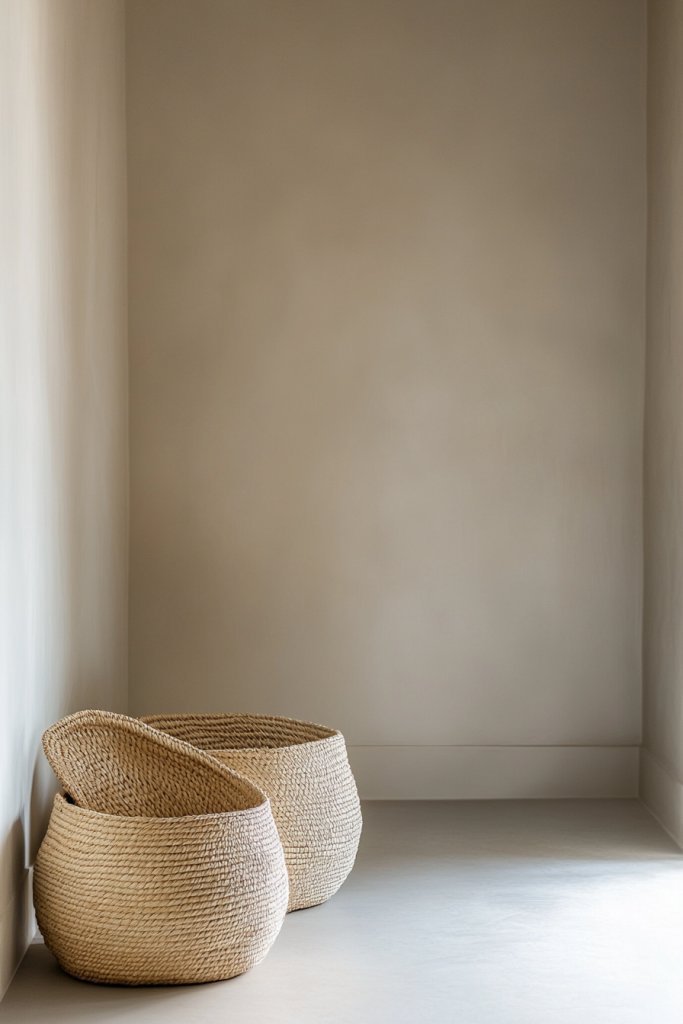 Picture textured baskets in natural fibers or colorful weaves placed on shelves or directly on the floor. They contain neatly folded textiles, small accessories, or seasonal gear. The tactile textures add warmth and depth to the space, making it feel inviting rather than cluttered. When filled, they create visual balance and harmony.