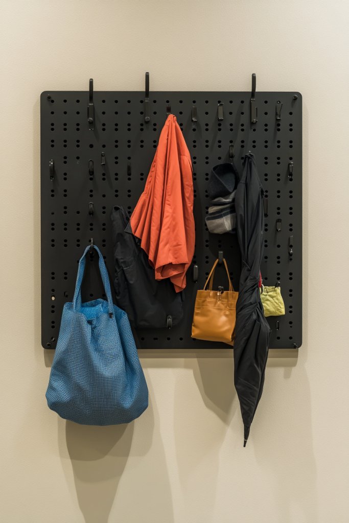 Visualize a sleek metal pegboard mounted on the wall, filled with hooks holding coats, backpacks, or umbrellas. The hooks are adjustable, so you can customize the arrangement whenever your needs change. The pegboard’s holes allow for creative layouts, making the space functional and visually interesting. Colorful hooks or painted pegboards inject personality.