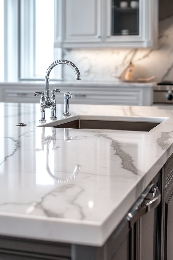 Imagine sweeping slabs of creamy, veined marble stretching across your workspace, catching the light with subtle shimmer. The seamless under-mount sink disappears into the surface, creating a clean, uninterrupted look. The smooth, glossy surface invites you to run your fingers over its cool, luxurious texture. It’s a visual and tactile delight that transforms your kitchen into a high-end showcase.