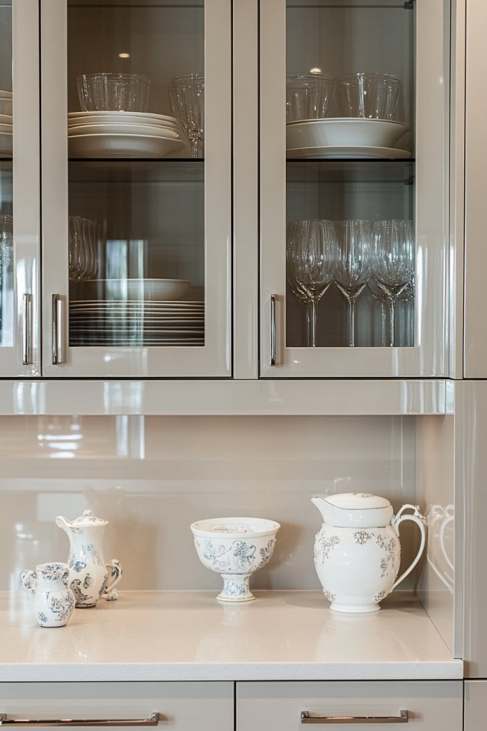 Envision cabinets with frosted or clear glass panels showcasing your elegant dishware and glassware. The soft-close hinges allow doors to close gently and quietly, adding a refined touch. The cabinetry features intricate moldings, decorative trims, and high-quality finishes that scream craftsmanship. The overall effect is a balanced mix of practicality and aesthetic appeal, creating a curated, upscale look.