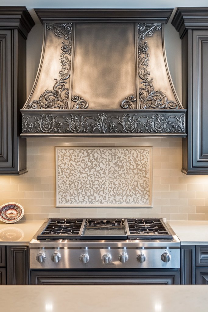 Picture a custom-built range hood with intricate metalwork or sleek modern lines, hanging over your stove like a work of art. The material might be brushed steel, brass, or painted metal, depending on your style. Decorative detailing such as ornate scrollwork or minimal geometric patterns adds personality. The hood’s presence anchors your kitchen, making it a focal point that commands attention.