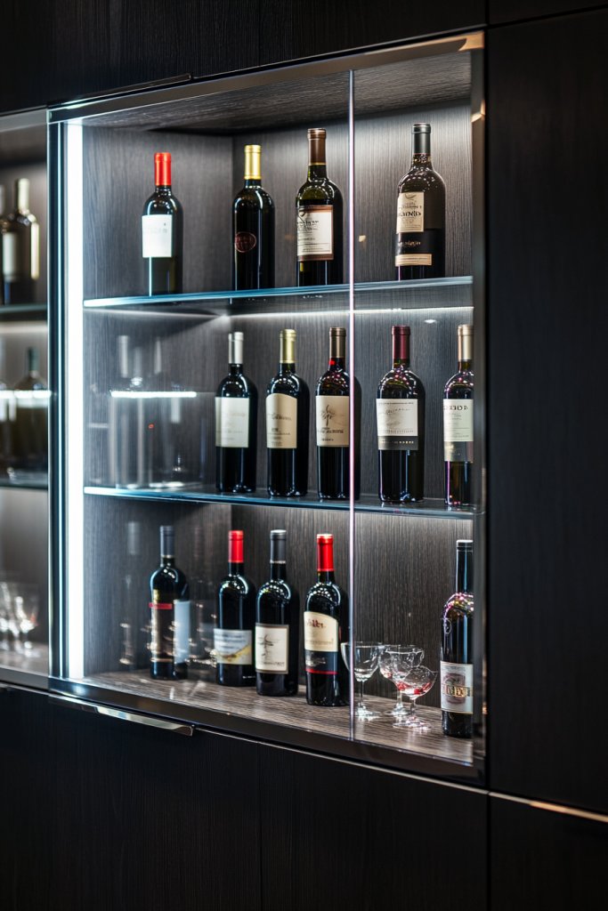 Picture a sleek, wall-mounted wine wall with individual slots or racks, illuminated by soft LED lighting. The glass-front cabinets showcase your bottles in a curated display, with precise temperature control inside. The combination of glass, metal, and wood creates a modern, luxurious vibe. Your wine collection becomes a visual centerpiece that invites admiration.