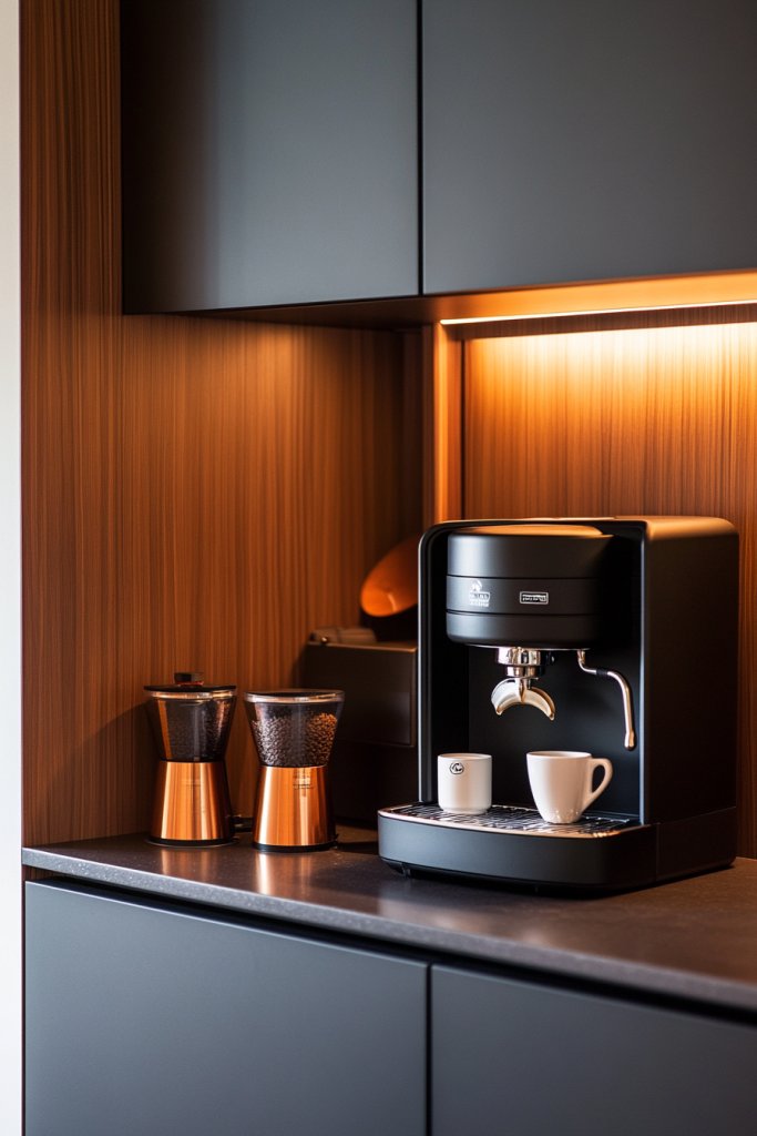 Picture a sleek, custom cabinet housing a high-end espresso machine, with soft lighting highlighting its polished surfaces. Nearby, a polished quartz countertop holds your favorite mugs and accessories, all within arm’s reach. A subtle pull-out drawer reveals neatly organized coffee pods and filters. The entire setup exudes efficiency and elegance, making your mornings feel special.