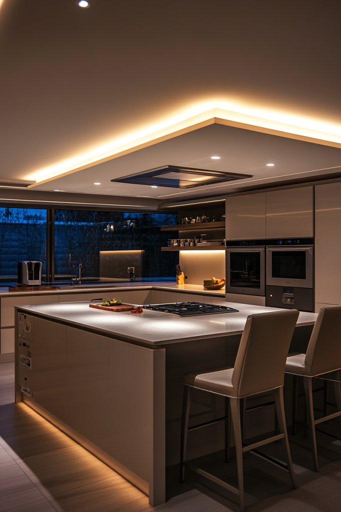 Imagine soft, warm LED strips under cabinets casting a gentle glow over your workspace. Overhead, sleek fixtures can be dimmed from bright to cozy with a simple tap on your phone or a voice command. The lights respond seamlessly to your needs, whether you’re chopping vegetables or hosting friends. The overall effect is a layered, dynamic ambiance that elevates your entire kitchen experience.