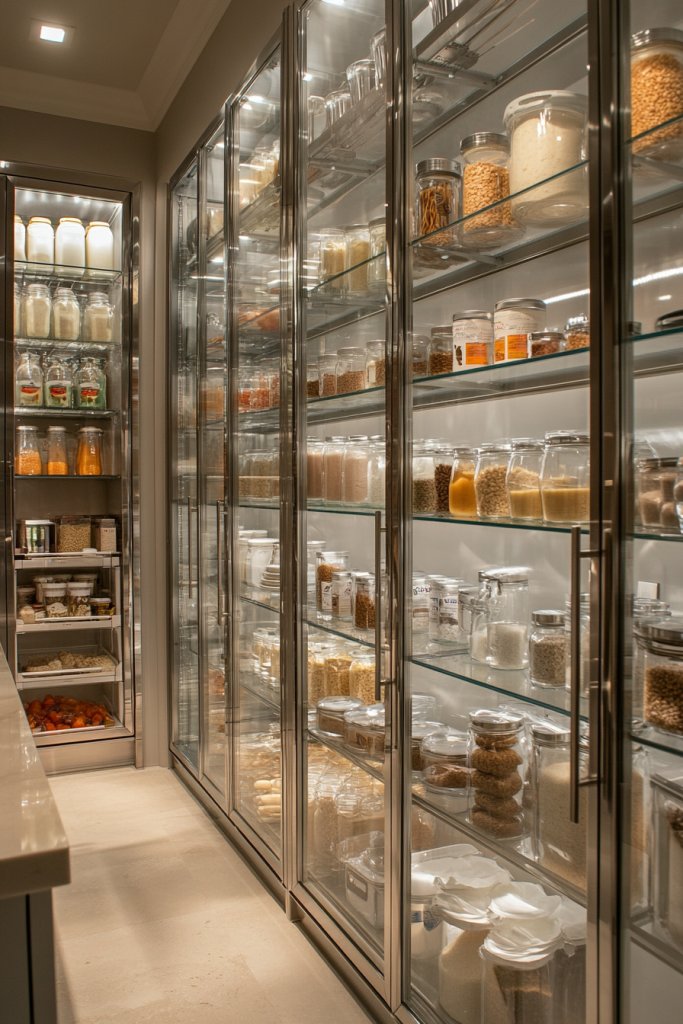 Visualize a spacious, well-lit room or closet with glass-front cabinets showcasing neatly arranged jars, cans, and specialty items. The interior is illuminated with LED strips that highlight every shelf. Customizable shelving maximizes storage, while pull-out drawers hide less attractive items. The overall look is clean, organized, and inviting—an instant upgrade for any serious home chef.