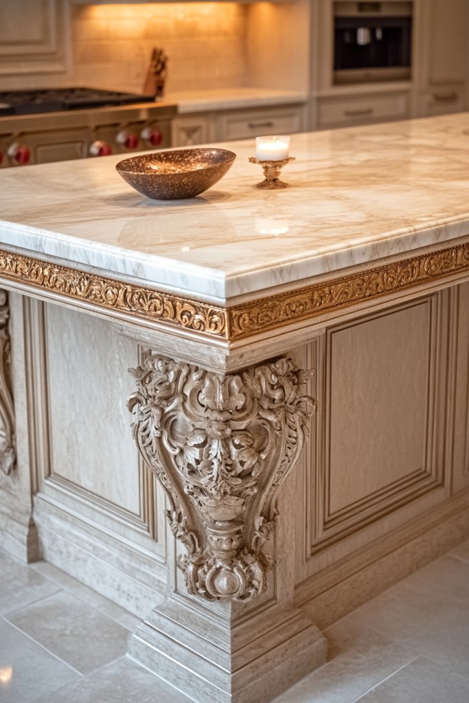 Picture a massive island with a waterfall countertop, where the material flows seamlessly over the edges. The cabinetry features intricate moldings or custom carvings, adding a touch of luxury. The surface invites you to sit on upholstered stools, turning it into a social hub. Subtle lighting fixtures cast a warm glow over the elegant details, making it the heart of your kitchen.