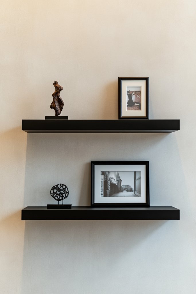 Envision sleek, minimal floating shelves mounted at varying heights along your wall. Decorated with artful objects, framed photos, or carefully arranged books, they turn a blank wall into a visual story. The open design creates a sense of space while offering a platform for your personality to shine through. Light-colored or wood-finish shelves blend seamlessly into most decor styles.
