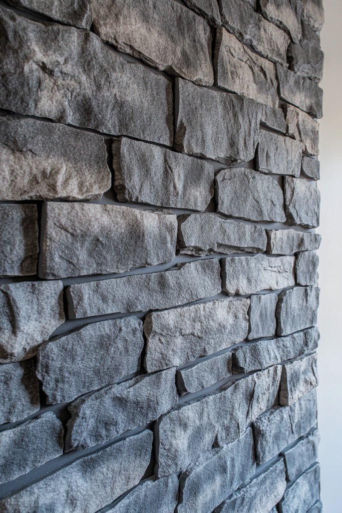 Imagine a wall layered with textured faux stone tiles in warm earthy tones—think warm grays, browns, or slate blues. The uneven surfaces and natural-looking grout lines mimic real stone, adding tactile depth. The rough texture contrasts beautifully with smooth, modern furniture, creating a balanced aesthetic. When illuminated, the stones cast subtle shadows that enhance their rustic appeal.