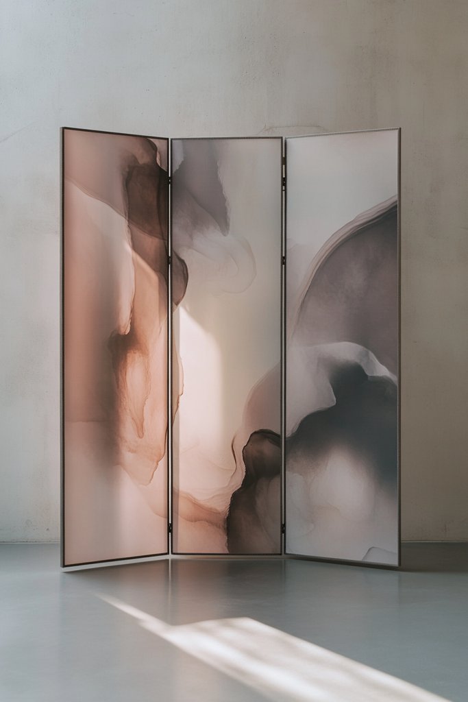 15. Wall-Mounted Folding Screens with Artistic Prints for Flexible Privacy
