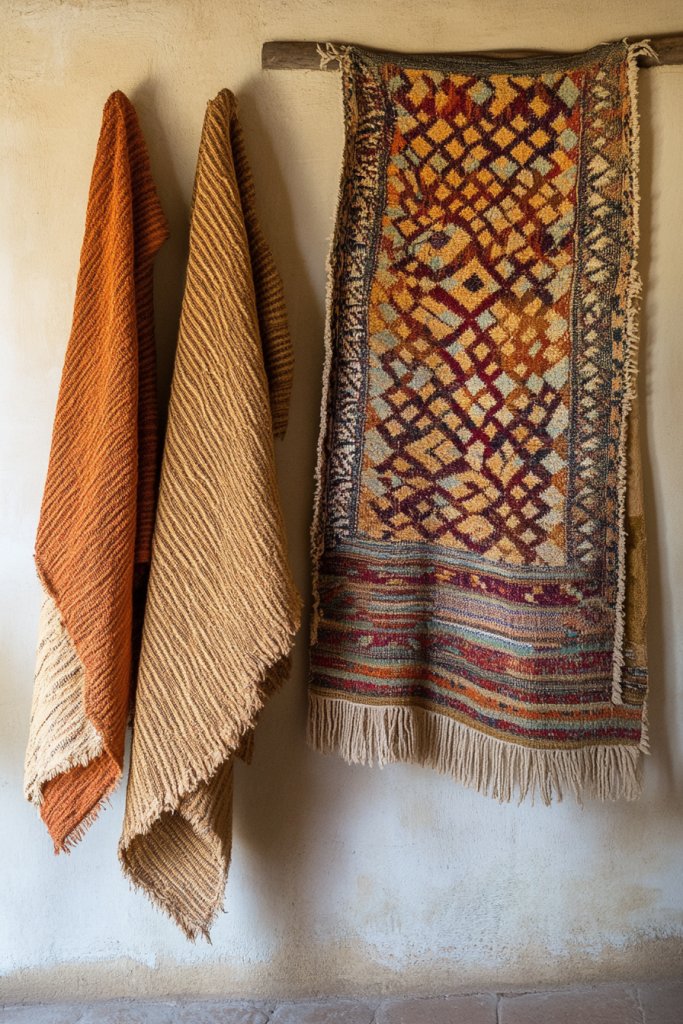 Use sturdy hooks, rods, or tension wires to hang your textiles securely. Arrange them in overlapping layers or spaced for a more relaxed vibe. Ensure the textiles are clean and free of dust before hanging. For extra impact, add decorative trims or tassels. Keep the hangings in good condition by dusting regularly and avoiding direct sunlight to prevent fading.