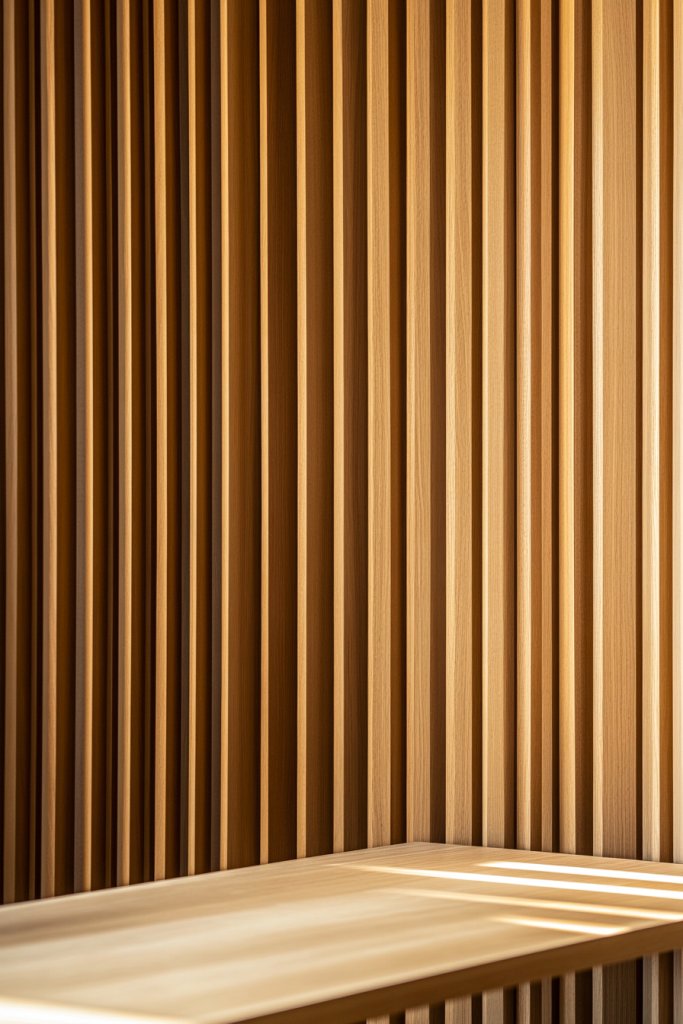 Imagine sleek, vertical wood slats running from floor to ceiling, their rich grain catching the light with every movement. The natural variation in wood tones adds depth and texture, making the wall a statement piece. The spacing between slats creates a rhythmic pattern, giving your space a contemporary edge. Light filtering through the gaps adds a dynamic play of shadows, enhancing the cozy feel.