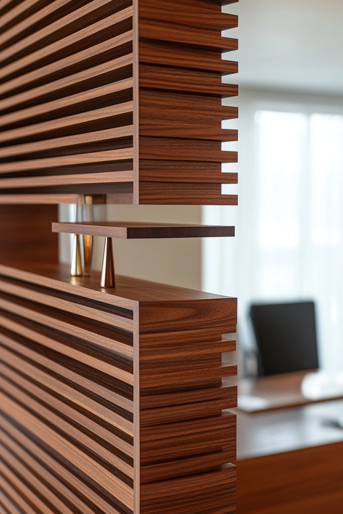 A slatted wall divider combines style and function, making your workspace more defined and inviting. It’s a versatile feature that can grow with your needs and taste. Once installed, it transforms an open room into a productive haven. Ready to add a touch of modern elegance and privacy?