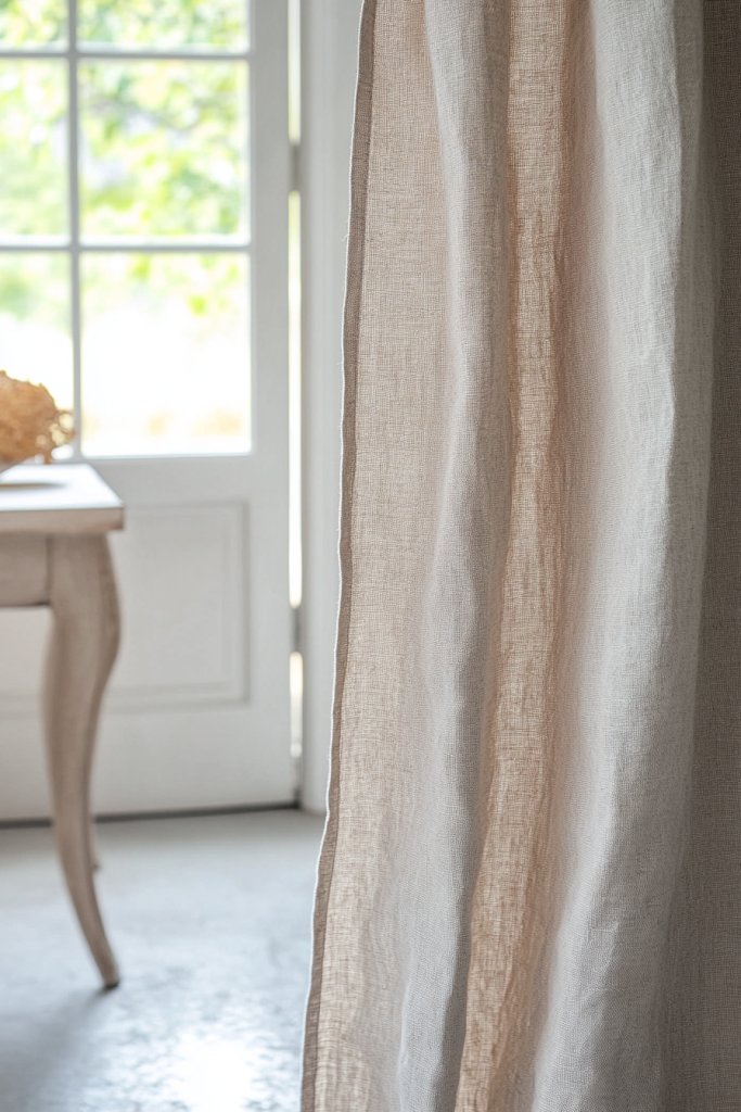 Visualize a flowing, lightweight linen curtain in a neutral tone, gently billowing in the breeze or when you move. The fabric has a slightly wrinkled, washed appearance that adds charm and texture. When drawn across your doorway, it creates a semi-private zone that feels inviting and calm. The soft, natural fibers evoke a sense of tranquility and simplicity.