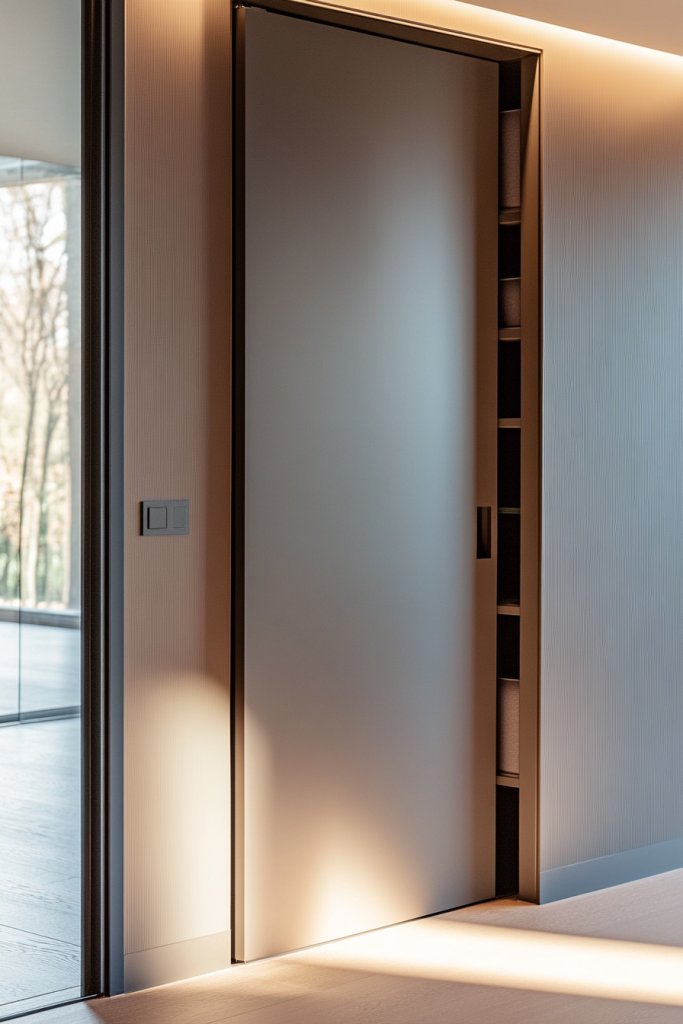 Imagine a sleek, flush wall with a hidden door that seamlessly disappears when open. Behind it, you find shelves, cubbies, or drawers filled with office supplies, files, or personal items. When closed, it looks like a smooth wall; when open, reveals a practical storage zone. This clever design keeps your space tidy and stylish, blending function with minimalism.