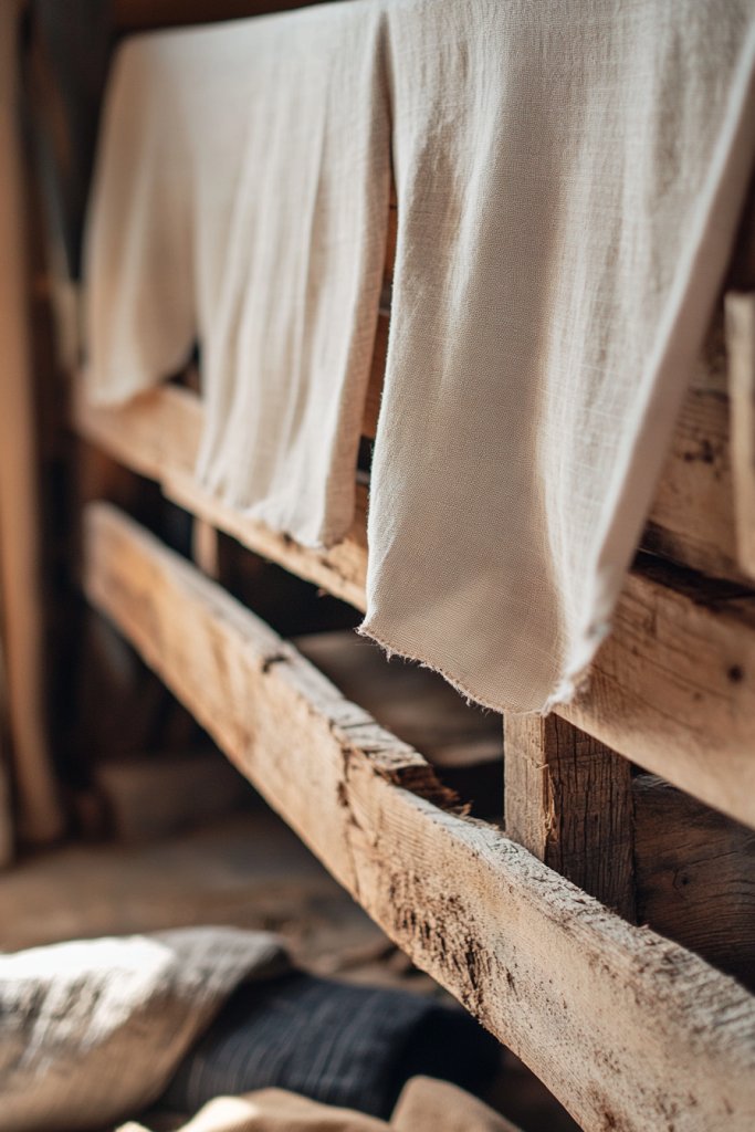 Picture a sturdy wooden frame made from reclaimed pallet planks, its rough-hewn texture adding rustic charm. Drape a soft, neutral-toned fabric—like linen or burlap—over the frame, secured with staples or tacks. When hung, it creates a semi-private barrier that’s both functional and visually appealing. The contrast of raw wood and soft fabric adds layered depth to your space.