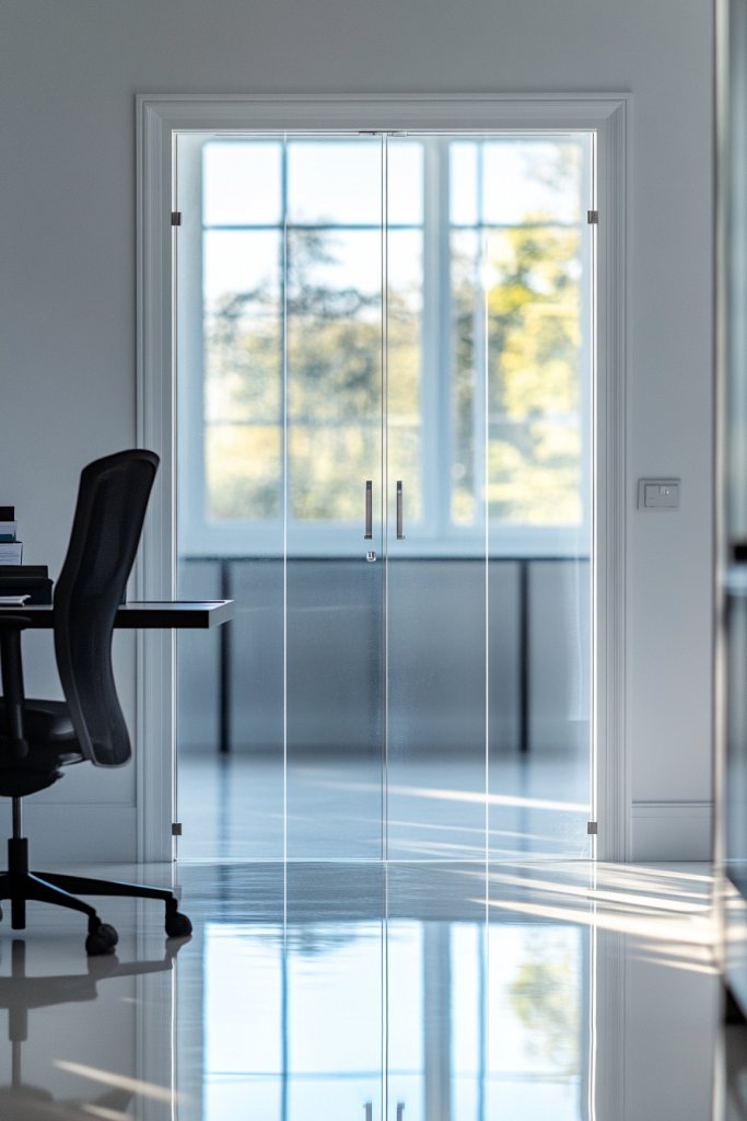 Dreaming of a modern, unobtrusive way to partition your home office? Transparent acrylic doors offer a sleek, minimalist option that maintains openness while providing privacy. They’re perfect for small spaces or contemporary interiors that value clean lines and light. If you want a subtle yet stylish divider, this idea is for you.