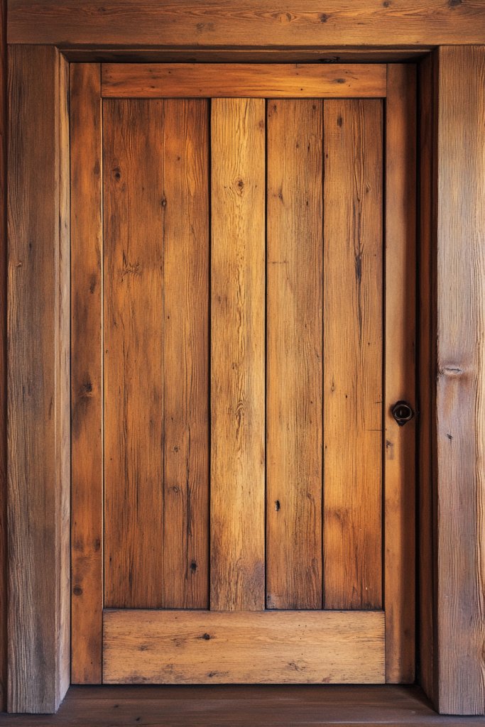 Picture a door made from salvaged wood planks with varying textures and tones—weathered browns, silvery greys, and rich chestnuts. The natural imperfections, knots, and grain patterns add authenticity and depth. When installed, it creates a textured backdrop that contrasts beautifully with sleek modern furniture. The natural finish complements botanical accents and neutral interiors, creating a cozy, organic vibe.