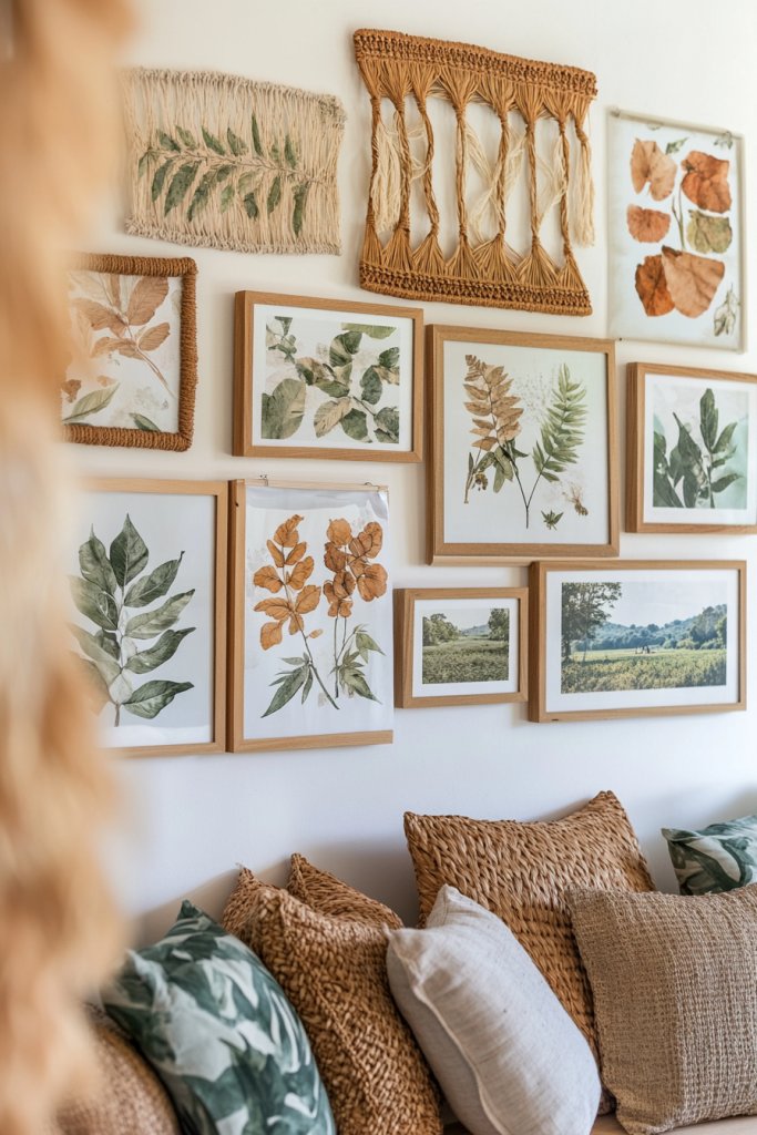 Picture a wall decorated with framed botanical prints—leaves, flowers, or trees—in wooden or rattan frames. The natural textures of woven wall hangings or cork boards complement these prints beautifully. Incorporate elements like driftwood, stone accents, or bamboo shelves to enhance the earthy feel. The color palette—greens, browns, soft neutrals—supports a peaceful, grounding environment. The overall look is fresh, vibrant, and deeply connected to nature.