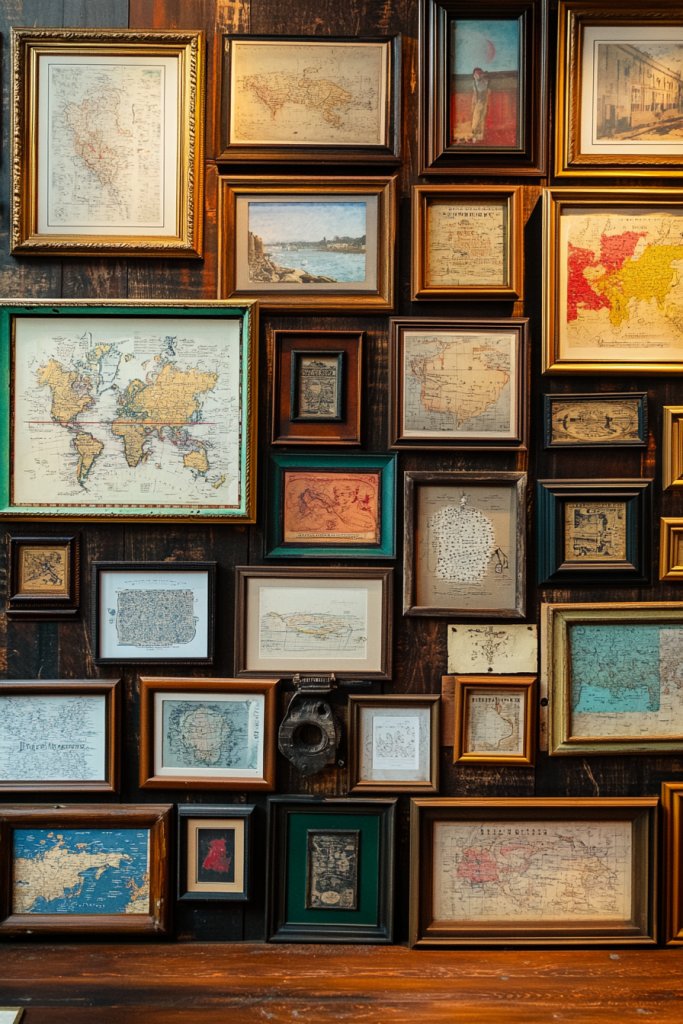 Visualize a wall filled with ornate, vintage frames—think brass, distressed wood, or ornate gilded styles. Inside, you might display antique prints, old maps, or vintage photographs with aged patinas. The mix of intricate frames and faded images creates a layered, nostalgic atmosphere. The overall effect transports you to a different era, inspiring creativity and reflection. Soft, warm lighting enhances the aged feel, adding to the allure.