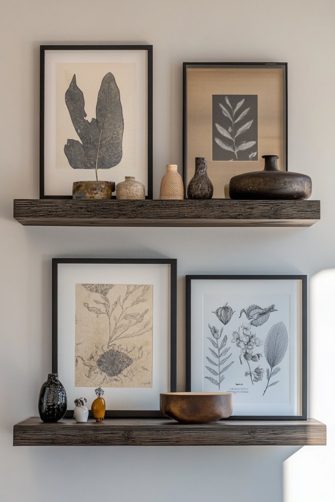 3. Vertical Gallery with Floating Shelves and Art Prints