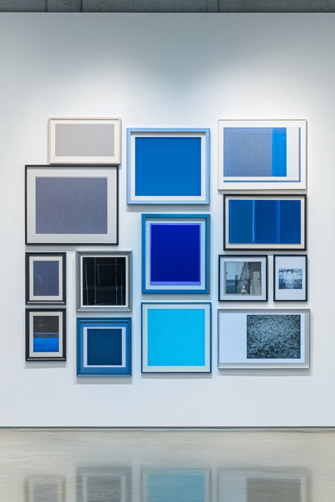 Visualize a wall where artwork and frames are grouped into sections based on color—blues, reds, neutrals—or patterns like stripes or grids. Each block contains a set of related pieces, creating a structured yet playful design. The color blocks visually organize the display while adding vibrancy and rhythm. This approach makes your wall look curated and harmonious, even if the artwork varies in style.