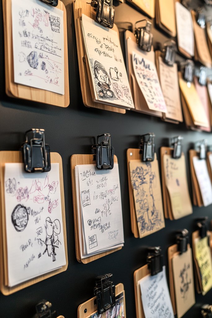 Envision a wall dotted with clipboards holding different prints, sketches, or inspirational notes. The clipboards can be hung in a grid or scattered asymmetrically for a more relaxed feel. You could also include a few with handwritten notes or doodles, adding a personal touch. The metallic clips and simple frames give an industrial-chic look, perfect for a modern or eclectic style.