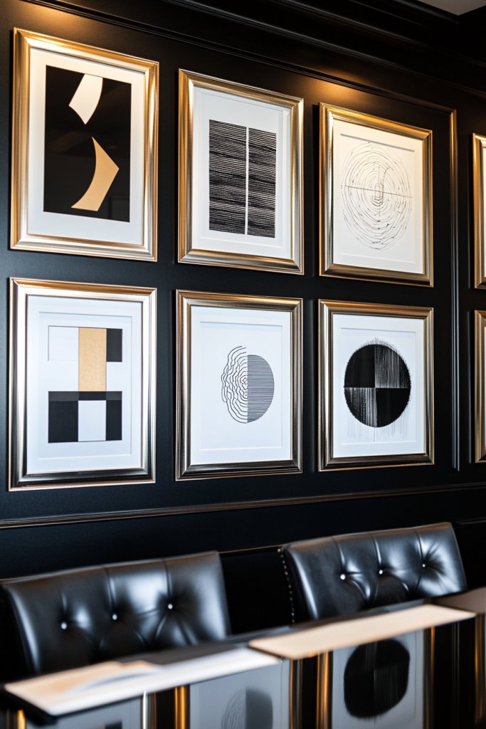 Picture a wall decorated with black, white, and shades of gray framed artwork or prints. Metallic frames or accents—like gold, silver, or copper—add reflective surfaces that catch the light beautifully. The contrast between matte backgrounds and shiny metallic borders creates a striking visual impact. The overall effect is sleek, with a hint of opulence that makes your workspace feel special.