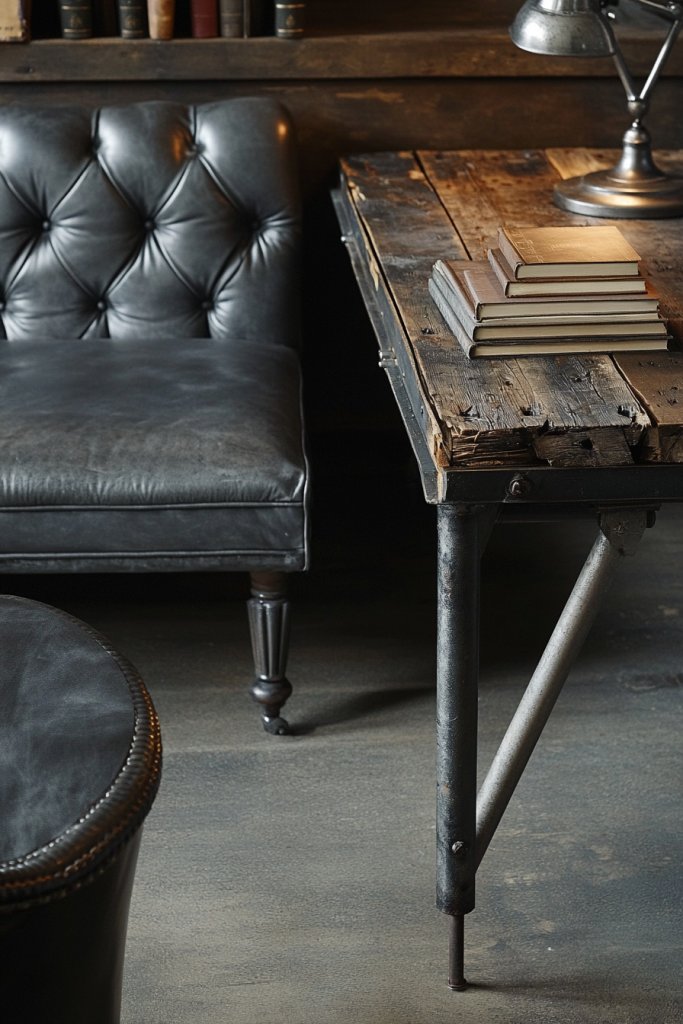 Choose a sturdy metal-frame or leather sofa that complements your space’s scale. Pair it with a reclaimed wood desk that offers ample workspace and storage. Install industrial lighting fixtures—think pendant or wall-mounted sconces—to highlight the work area. Use metal or wire shelving for organization, keeping clutter out of sight. Add textured, durable textiles for cushions and throws to humanize the raw materials.