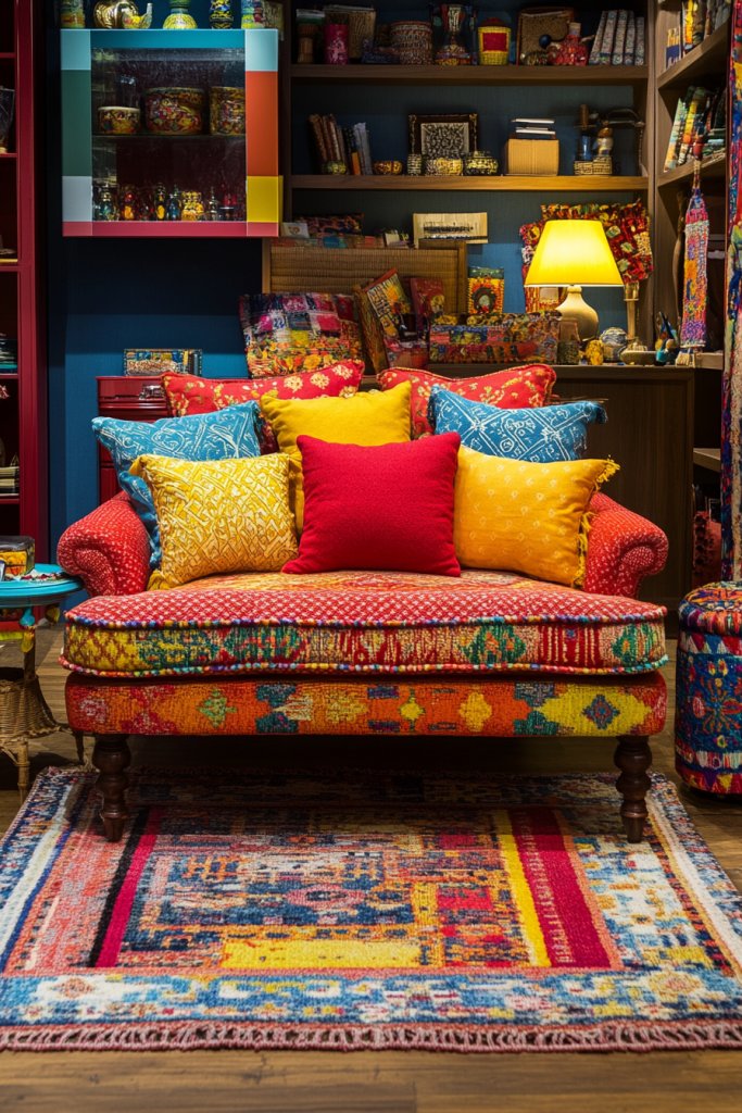 Use a mix of bright hues with neutral backgrounds to avoid visual chaos. Incorporate playful cushions, throws, and accessories in contrasting patterns and textures. Seasonal updates could include swapping out cushions or adding fun textiles like pom-pom throws or fringed rugs. Keep the furniture simple and let the accessories do the talking for a vibrant, lively atmosphere.