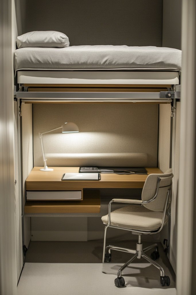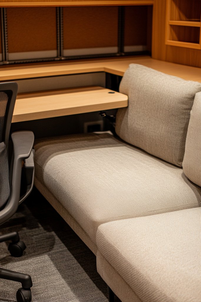 Picture a sleek, modern sofa that easily converts into a bed, with a small, fold-out desk attached or nearby. During the day, it functions as a stylish seating area; at night, it transforms into a cozy sleeping nook. The workspace features a slim, minimalist surface with hidden compartments for supplies. Soft textiles and subtle lighting make the space inviting, whether for work or relaxation.