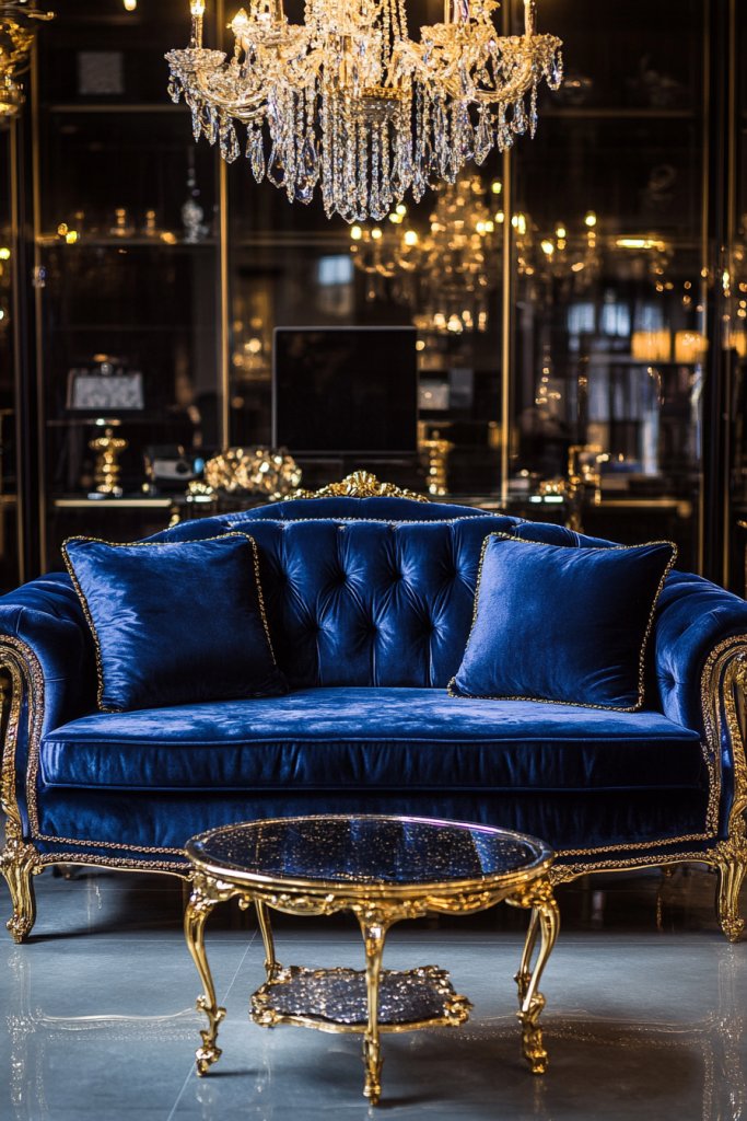 17. Luxe Velvet Couch with Gold Accents and Elegant Lighting