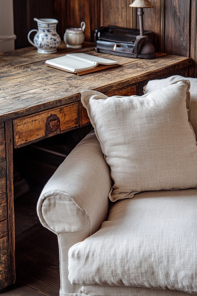 Picture a vintage-inspired brick wall backdrop, with a weathered, distressed couch upholstered in soft, neutral fabrics. In front, a reclaimed wood desk with rough-hewn edges adds authenticity. The scent of aged wood and soft lighting from a wrought-iron fixture creates a warm glow. Decorative accents like woven baskets and antique metal accessories complete the look, giving your workspace a storybook feel.