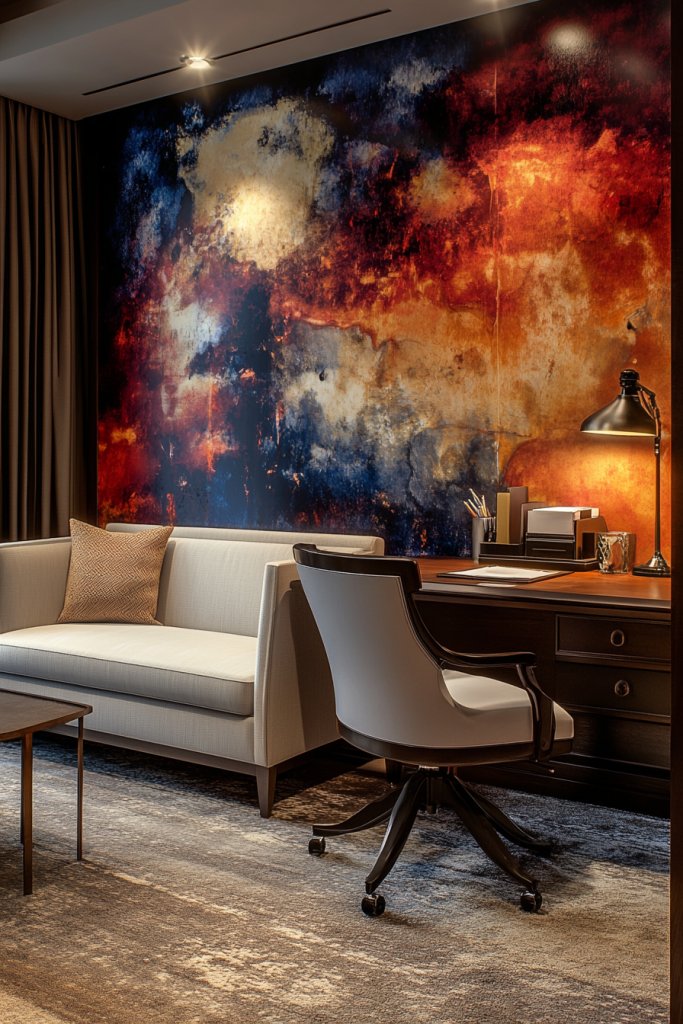 Imagine a textured, painted, or wallpapered wall featuring bold colors, patterns, or subtle textures that complement your furniture. The wall provides a dramatic backdrop for a cozy couch and a sleek, functional desk. Soft lighting highlights the artwork or texture, creating depth and interest. Decor accents are kept minimal to keep the focus on the wall, which becomes the statement piece of your workspace.