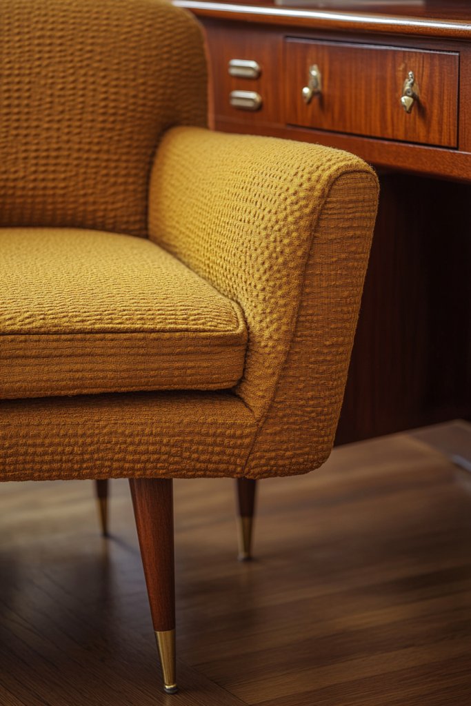 Picture a sleek, tapered-legged sofa in a warm, muted hue like mustard or teal, paired with a vintage-inspired wooden desk that features rounded edges and tapered legs. The room is illuminated by warm, soft lighting, with geometric patterned rugs grounding the space. Decorative accents include minimalist lamps, textured cushions, and a few retro accessories, creating a perfect balance of nostalgia and modernity. The ambiance feels inviting, stylish, and a bit playful.