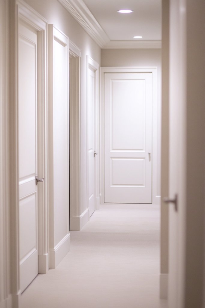 Imagine walking into a room where the doors are a crisp, matte white, bouncing natural sunlight around. The smooth finish complements neutral walls, while subtle shadows highlight their clean lines. The texture is soft to the touch, and the simplicity creates a seamless flow from room to room. It’s like a breath of fresh air in your home’s design.