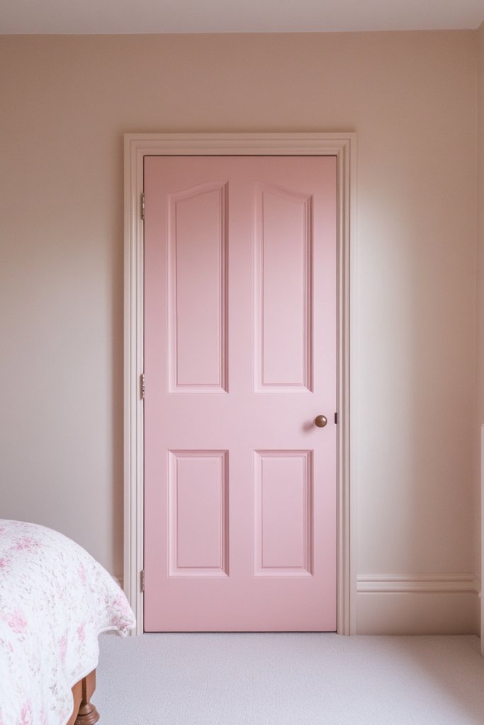 Visualize a softly pink door with a matte finish, paired with white or neutral walls. The hue is warm and inviting, creating a cozy atmosphere. Small decorative hardware in brushed gold or antique brass adds a touch of sophistication. The overall look is delicate yet curated, drawing attention without overwhelming the senses.