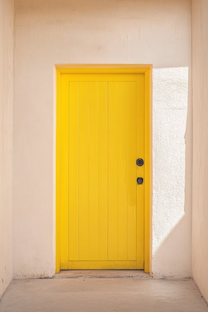 Imagine a sunny yellow door with a glossy or semi-gloss finish, catching the light and drawing attention. The color contrasts beautifully with neutral or darker walls, creating a lively focal point. Complement with colorful accessories, playful hardware, or patterned rugs nearby. The shiny surface enhances the brightness, making the space feel warm and inviting.