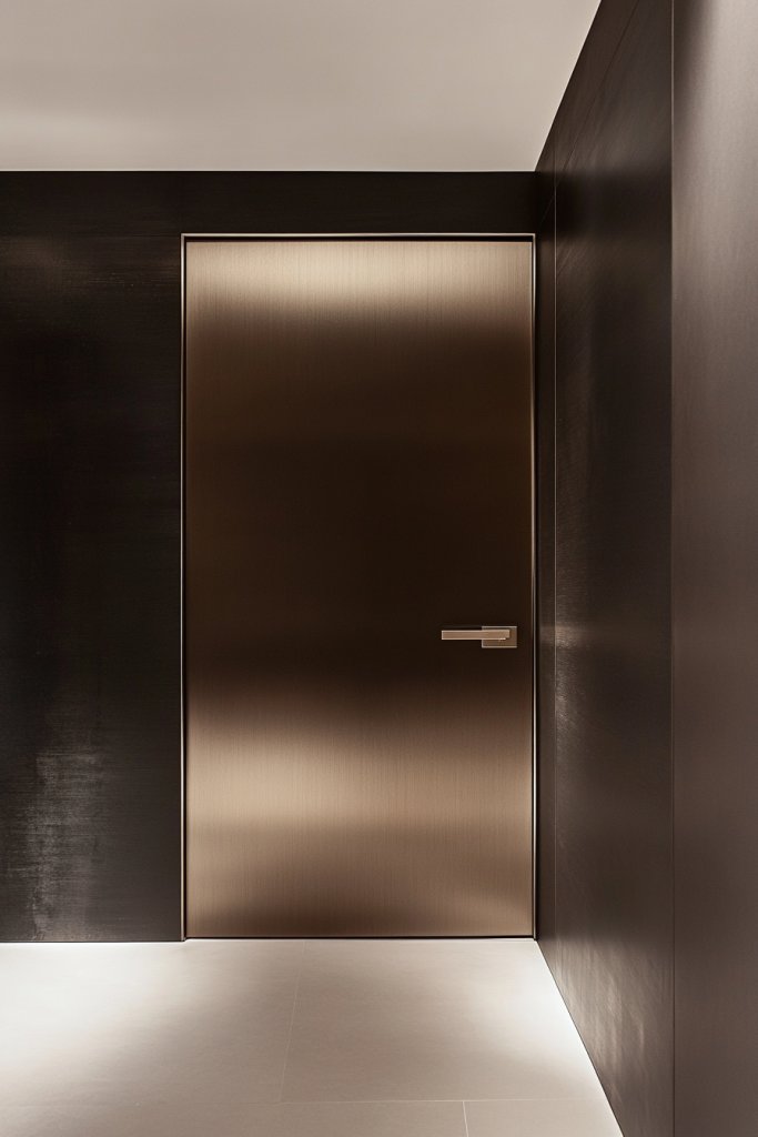 Visualize a matte bronze or brushed gold door with a sleek, minimalist handle. The muted metallic sheen adds depth and texture, catching light softly while maintaining a subdued, upscale look. Paired with matte walls and clean lines, it creates a sophisticated atmosphere. The finish feels velvety to the touch and looks refined from every angle.