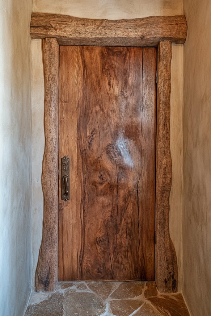 Imagine doors with rich, warm wood stains showing off unique grain patterns, set against neutral or white walls. The natural finish adds depth and character, making each door a piece of art. The tactile surface invites touch, and the subtle variations in color emphasize the organic quality. Paired with simple hardware, it creates a timeless, cozy ambiance.