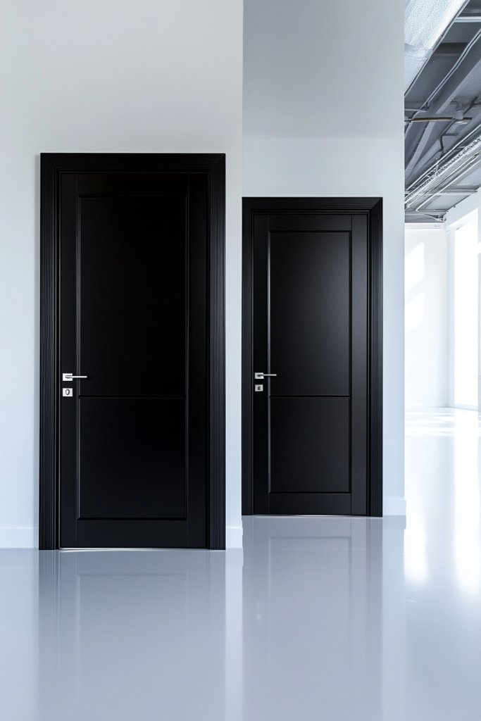 Picture a matte black door set against a crisp white wall, accented with metallic hardware. The dark hue creates a sense of depth, making the space feel more intimate and refined. The texture varies from velvety matte to glossy shine, depending on your preference. Shadows play across the surface, emphasizing the door’s bold presence. It’s like a piece of art you can walk through.
